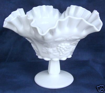 This is a difficult to find Westmoreland Glass product in the #1881 Paneled Grape pattern. Created in White Milk Glass, it is a beautiful accent piece which illustrates the quality workmanship of the Westmoreland Glass company. This is a bowl or compote (PG-134), stem footed, with a crimped and ruffled edge. Quite a combination of glass making methods in one piece. It stands 6-1/4” high and is 8” in diameter. It is in perfect condition and is marked with the “W” superimposed over the “G”. I sell only original Westmoreland Glass pieces produced between 1888 and 1984 at the factory in Grapeville, PA.