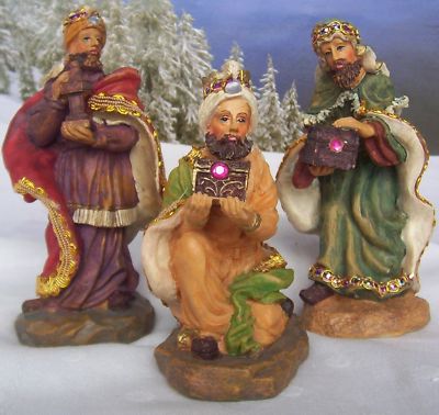 Here is a very colorful and ornate Nativity set that would look wonderful in a wooden crèche or other Christmas setting. Reminiscent of the Italian Fontanini Nativity pieces, this lovely set is of poly-resin with very nice detail. The 7 hand painted pieces range in size from 1-1/2” to 5-1/2” tall and are trimmed with colorful metallic cord and braid. Faux jewels on the 3 Kings complete the elegant look. A beautiful set!