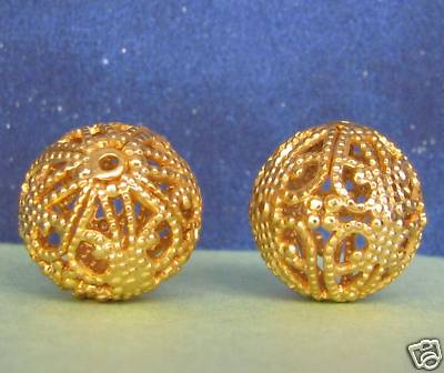 A beautiful and very ornate filigree ball measuring ¾” in diameter, about 19mm. A perfect piece to use in necklaces or bracelets, as an integral component of a unique, one of a kind Egg Stand or as a dazzling addition to a theatrical costume or belly dancers regalia. Sold in Groups of 2.