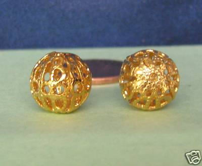 A lovely gold plated metal filigree ball, this orb would be a wonderful spacer bead in a necklace, bracelet or other jewelry item, adorning a theatrical costume or belly dancer’s rig, or an integral part of a unique, one of a kind egg stand. Lots and lots of uses. 3/8” in diameter (9mm) and sold in groupings of one dozen (12)
