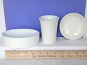 A lovely 3 piece set for your bathroom in pure white White China. Perfect as a China Painters pallet or lovely left in this pure state. The set consists of a 6 oz. tumbler standing 3-5/8” high with ‘Maryland China Japan’ on a gold foil label. A soap dish measuring 5-3/8” long x 3-3/8” wide x 1-5/8” high with ‘Exclusive Renaldy’s Fine China Japan’ on it’s gold label and a saucer shaped dish or hanging plaque (two holes in rim on back suggest that) measuring 4” in diameter and no label. All in perfect condition and ready to paint or use as is in this natural state.