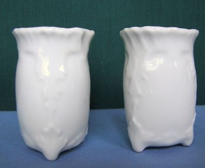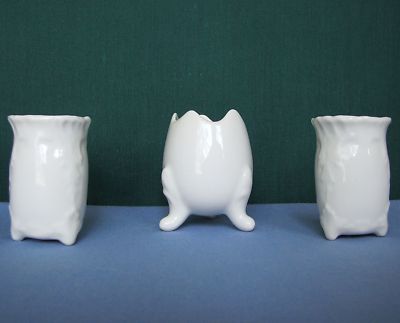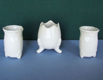Here are 3 White China Toothpick Holders or Miniature Vases for your China Painting pleasure, but just as cute in pristine plain White if desired. 2 different styles, one is an egg shaped creation, tri footed and standing 2-3/8” high marked ‘Japan‘. The other two are ornately embossed little charmers each standing 2-¼” tall with gold foil labels reading ‘Rynnes China Japan”. Lovely addition for the China Painter or for the person who likes lovely little things.
