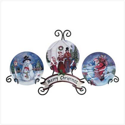 decorative porcelain plates on a metal rack with Merry Christmas banner.