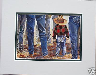 Using the watercolor skills she acquired at Parson's, Linda began drawing and painting the things that surround her - the ranching lifestyle gives her plenty of subject matter. The house is full of saddles, tack, denim jackets, cowboy boots and hats hanging from deer antler racks - much of the regalia that appears in her work. And, of course, horses, cowboys, children and fabulous flowers and landscapes are everywhere. Her fresh approach to these subjects is very popular and she is represented in collections nationwide.