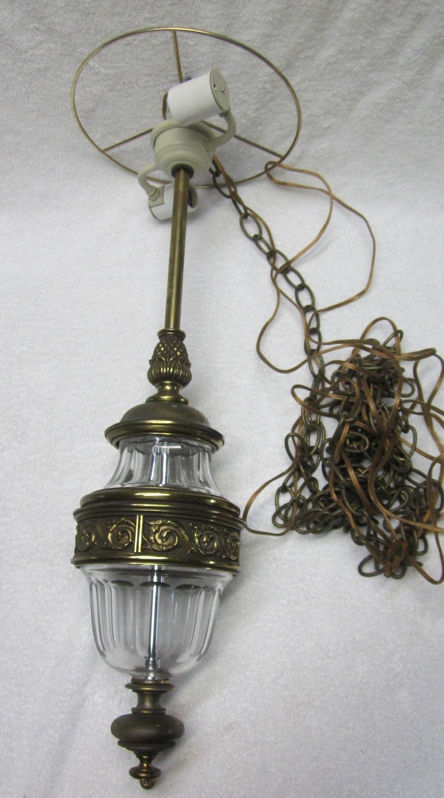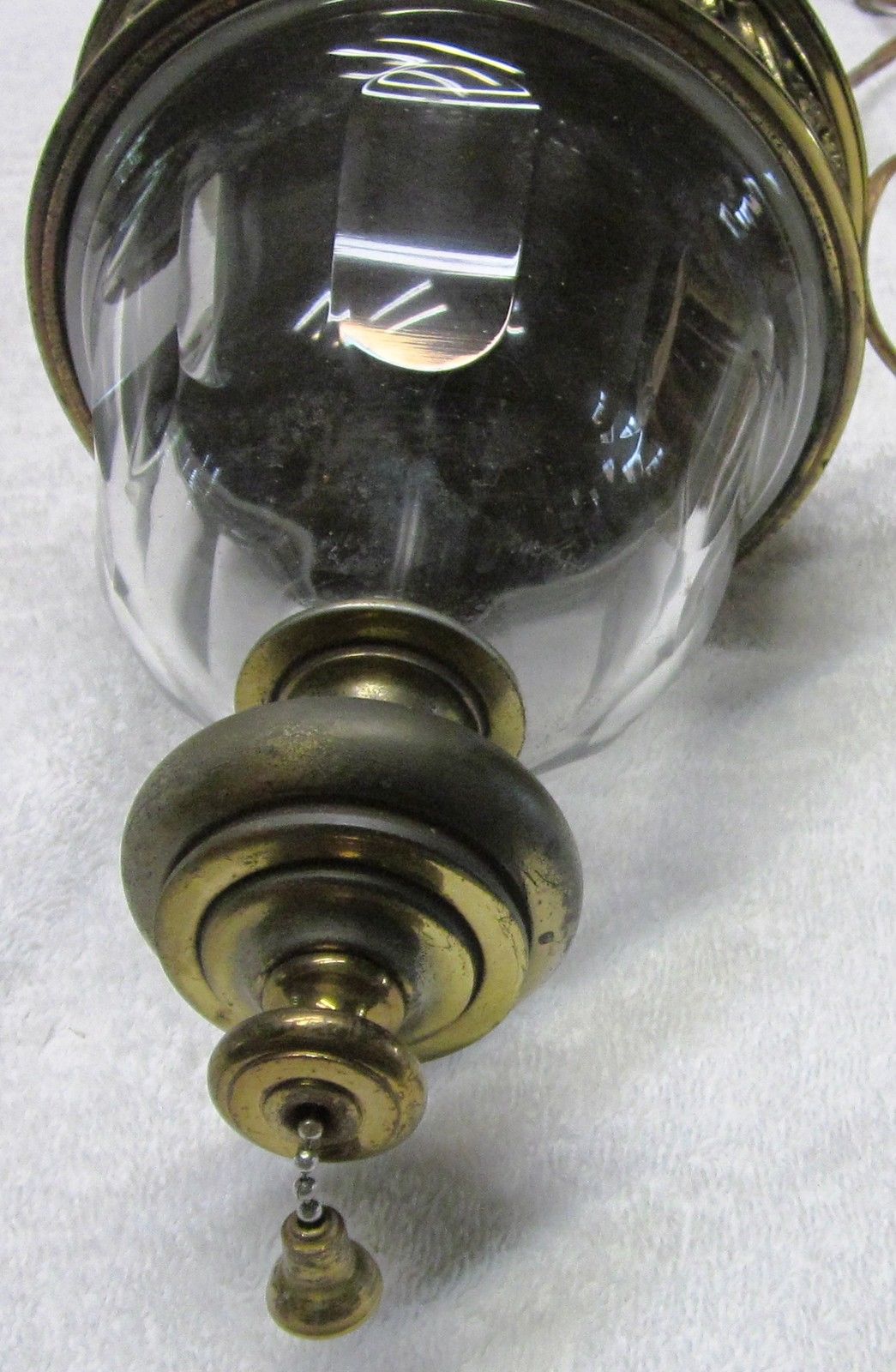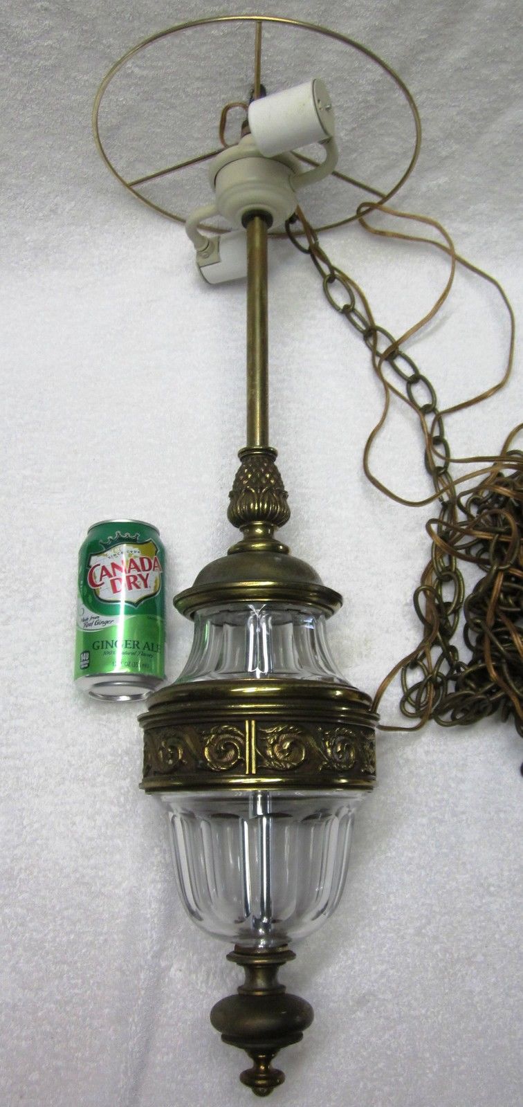 This wonderful Vintage Cut Clear Glass Crystal Hanging Parlor Chandelier Antique Brass hanging on a chain is in great well working condition. There is no shade included. The chandelier measures 29" tall.