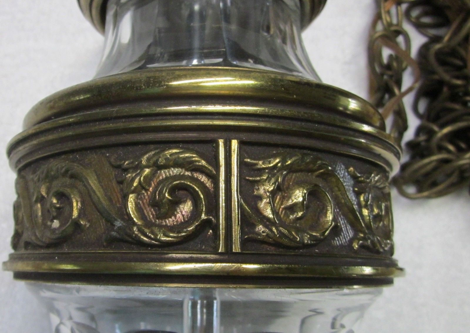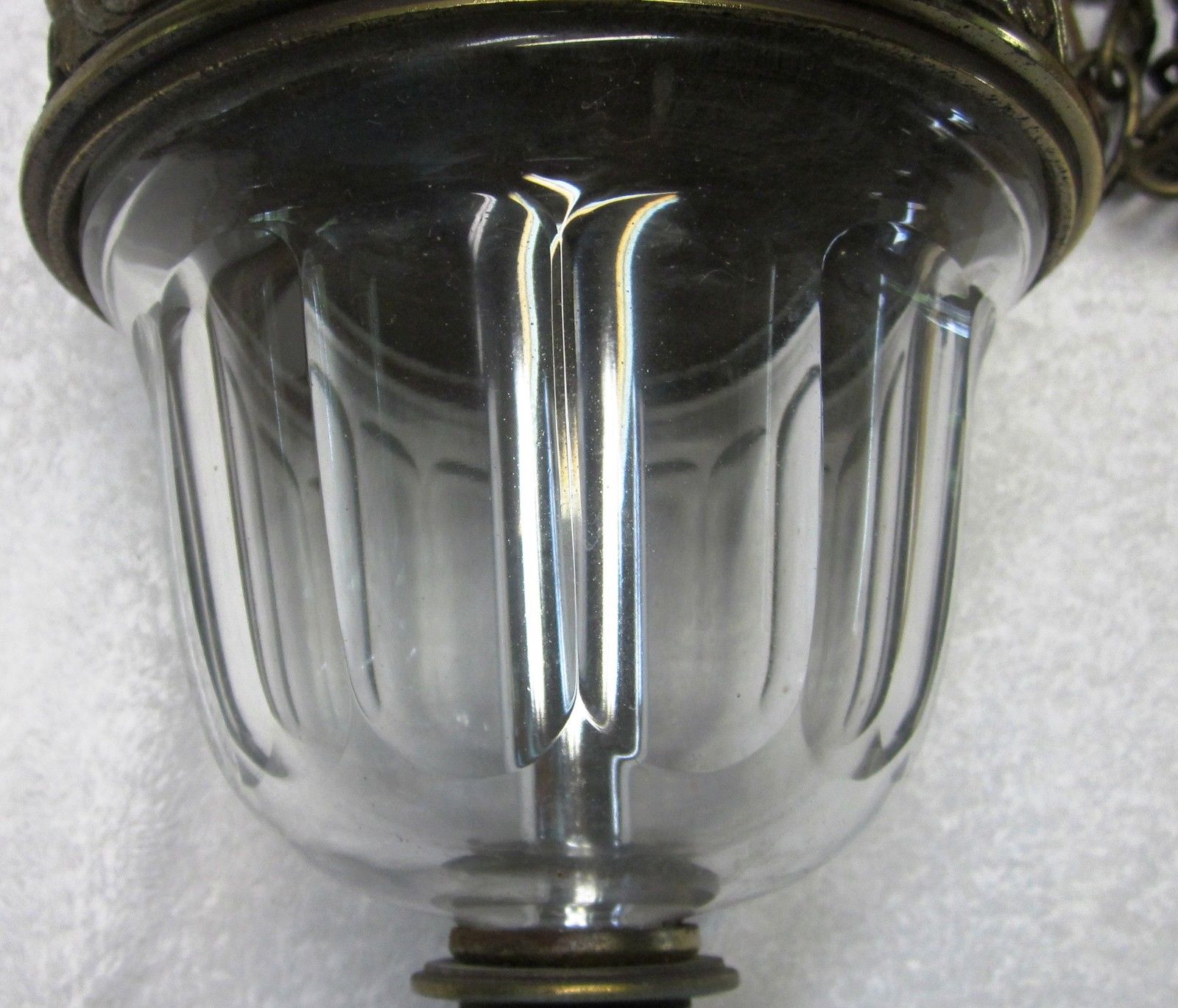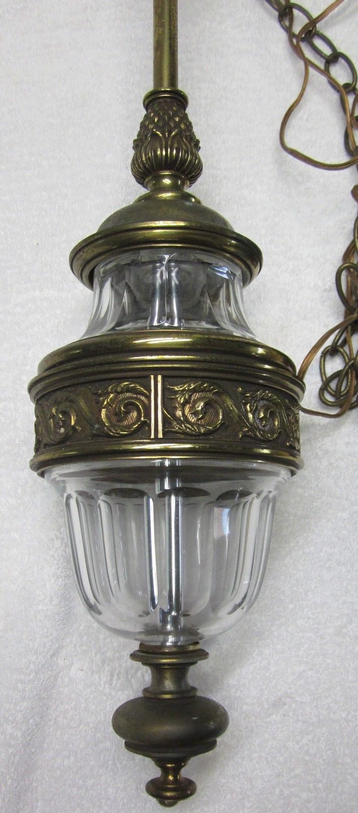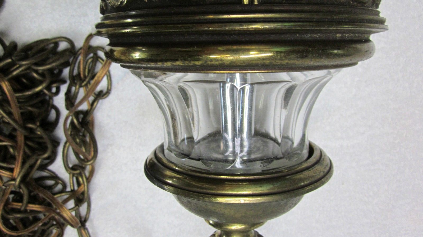 This wonderful Vintage Cut Clear Glass Crystal Hanging Parlor Chandelier Antique Brass hanging on a chain is in great well working condition. There is no shade included. The chandelier measures 29" tall.