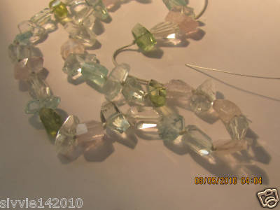 GAWK AT MY GEMS IS VERY EXCITED TO HAVE THIS MAGNIFICENT MULTI BERYL GEMSTONE STRAND. IT IS EDGY AND ELEGANT AND JUST NEEDS A CLASP AND YOU WILL BE THE ENVY OF ALL. DON'T BID ON THIS IF YOU DON'T LIKE ATTENTION AND TO BE GAWKED AT. THIS IS A ONE-OF-A-KIND BRAZILIAN UNTREATED NATURAL STRAND WHICH LOOKS LIKE ROCK CANDY AND BAROQUE SHAPED CRYSTAL FACETED CHUNKS. IT IS BREATHTAKING. THANK YOU FOR ALLOWING ME TO SHARE MY LOVE OF GEMS WITH YOU.