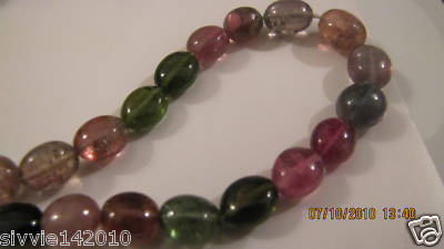 Beautiful 180ct untreated multicolored tourmaline strand in chubby oval shape. All you need is a clasp and you have a "Gawkable" piece of jewelry. THis is the envy of all tourmaline fans and quite a find. If you have any questions, please email me. I am a very nice person to deal with and my customers always come back because of the special customer service and expertise that I provide. Please do not hesitate...I am currently furthering my education at GIA to ensure the best knowledge on all the recent gem treatments and synthetics for both of our protection.
