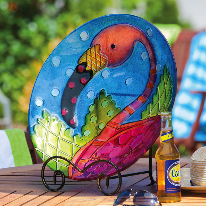 Why display a plain glass birdbath when you can put this out for your feathered friends?! Made of vibrantly colored glass, this birdbath can even be displayed indoors as a decorative bowl.- Made of glass