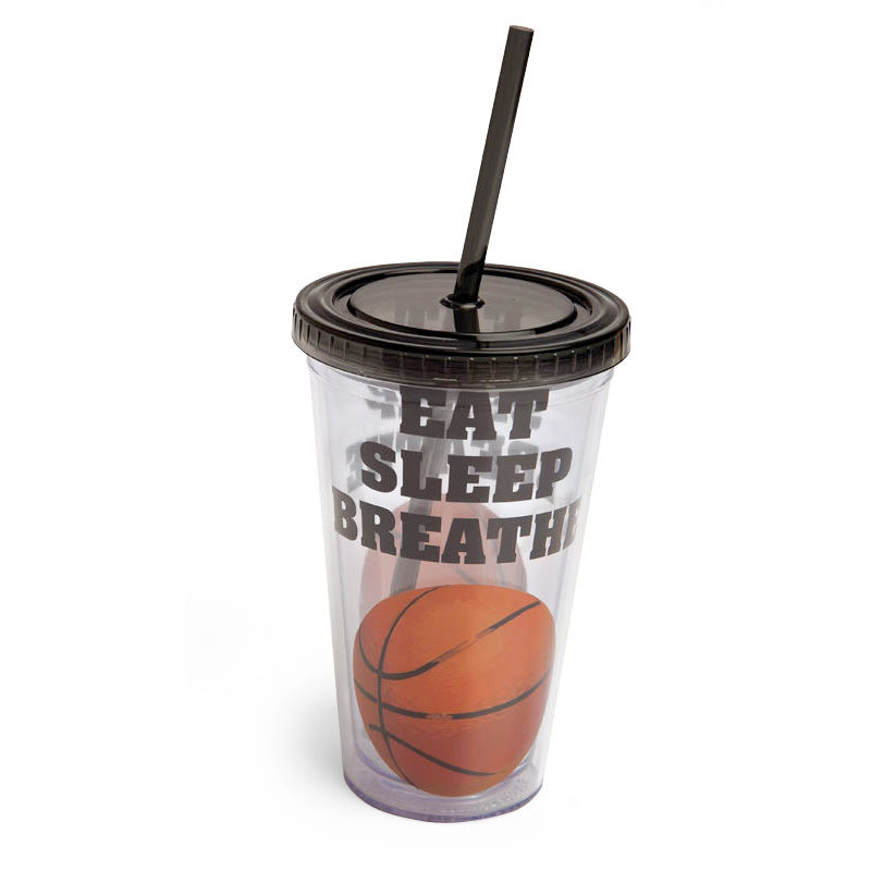 Who said cups with lids had to be boring? With a basketball front and center, this cup shows off true passion for the game, as it declares "Eat, Sleep, Breathe Basketball." Whether used for a party or adding color to the everyday, the Live Basketball Insulated Cup with Straw is perfect for kids, teenagers, and fun-loving adults.- 4"L x 4" W x 6.25"H