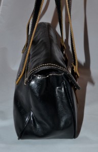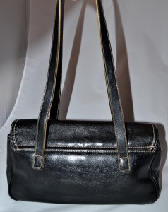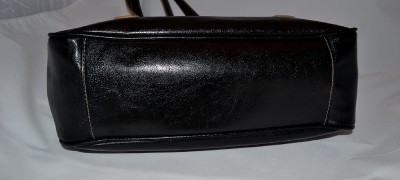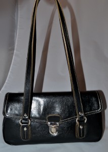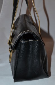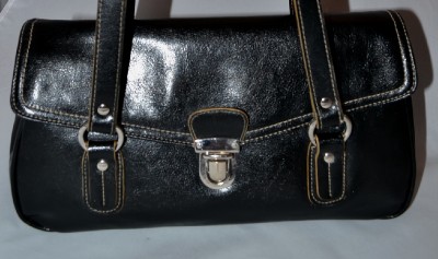 The exterior is black faux leather with a tan edging with silver fixtures. The handbag has a flap in the front with a slide snap closure.
