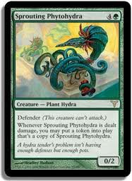 Defender (This creature can't attack.) Whenever Sprouting Phytohydra is dealt damage, you may put a token into play that's a copy of Sprouting Phytohydra.