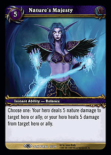 Choose one: Your hero deals 5 nature damage to target hero or ally; or your hero heals 5 damage from target hero or ally.