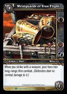 When you strike with a weapon, your hero has long-range this combat. (Defenders deal no combat damage to it.)
