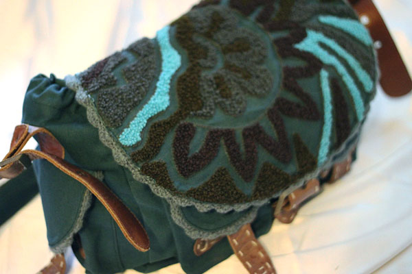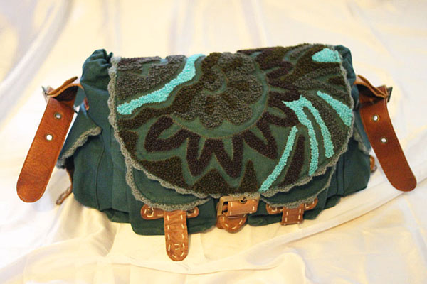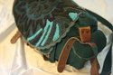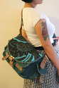 | Green jeans velvet bag with leather stripes. Handmade and crafted in Indonesia traditional Bali craftmanship