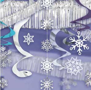 This kit has everything you need to turn your home into the ultimate winter wonderland! - 28 pieces - 4 Foil Swirls (36in) - 3 String decorations (4') - 3 String decorations (3') - 3 Snowflake cutouts (12in) - 3 Snowflake cutouts (15in) - 4 Foil Swirls w/ attachment (24in) - 4 Foil fringe garlands (12' x 5in) - 4 Foil fringe garlands (12' x 15in) - 1 Snowflake cutout (12in) - 1 Snowflake cutout (9in) - 1 Snowflake cutout (5.75in) - 1 String (for hanging cutouts, 50')
