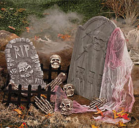 This 15 piece all-in-one cemetery kit is jam packed with Halloween decorations! ? 15 pieces ? 3 skulls ? 4 skeleton limbs ? 2 tombstones ? 2 cloths ? 4 fences