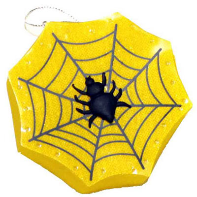 Easy to switch on LED decoration with spider, great on trees or by itself! - Yellow mesh stretched over metal frame - Black silhouette of a spider with web - Color changing lights - 3.75in dia. x 1.5in thick - Batteries included