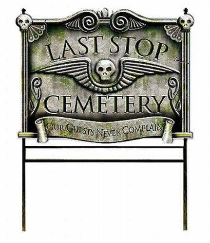 • Yard sign • Reads "Last Stop Cemetery — Our Guests Never Complain." • Measures 30 3/4" H x 25" W • Made of light plastic • Skull and wing details with faux stone finish • Metal stakes for grounding