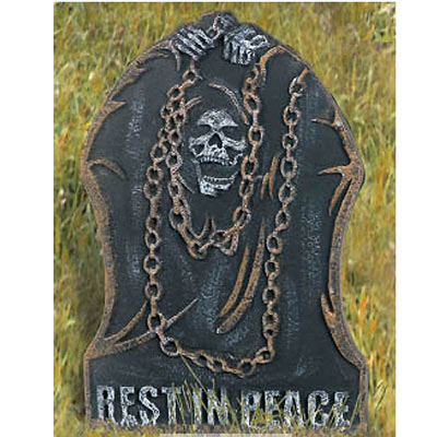 A creepy tombstone to transform your front lawn into a Halloween cemetery. - Grim reaper with chains - Stryofoam - Measures 22in High x 16in Wide x 0.75in Thick