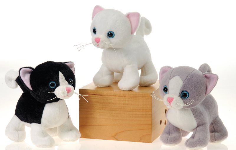 6"" 3 Assorted Color Cute Plush Kittens: black/white, white, gray/white." Case Pack 48
