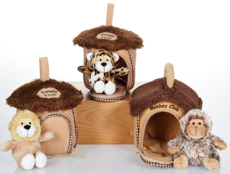 6"" 3 Assorted Jungle Animals In Hut: lion, leopard, and monkey. The hut has a handle for easy carrying and a zipper closure." Case Pack 24