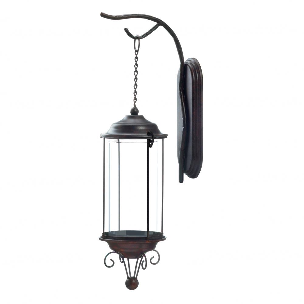Beauty abounds with this dramatic candle wall sconce. The branch-like wall-mounted hook is the perfect place for this classic hurricane lantern, with its antiqued finish and curling flourishes, to hang. Iron and glass.
