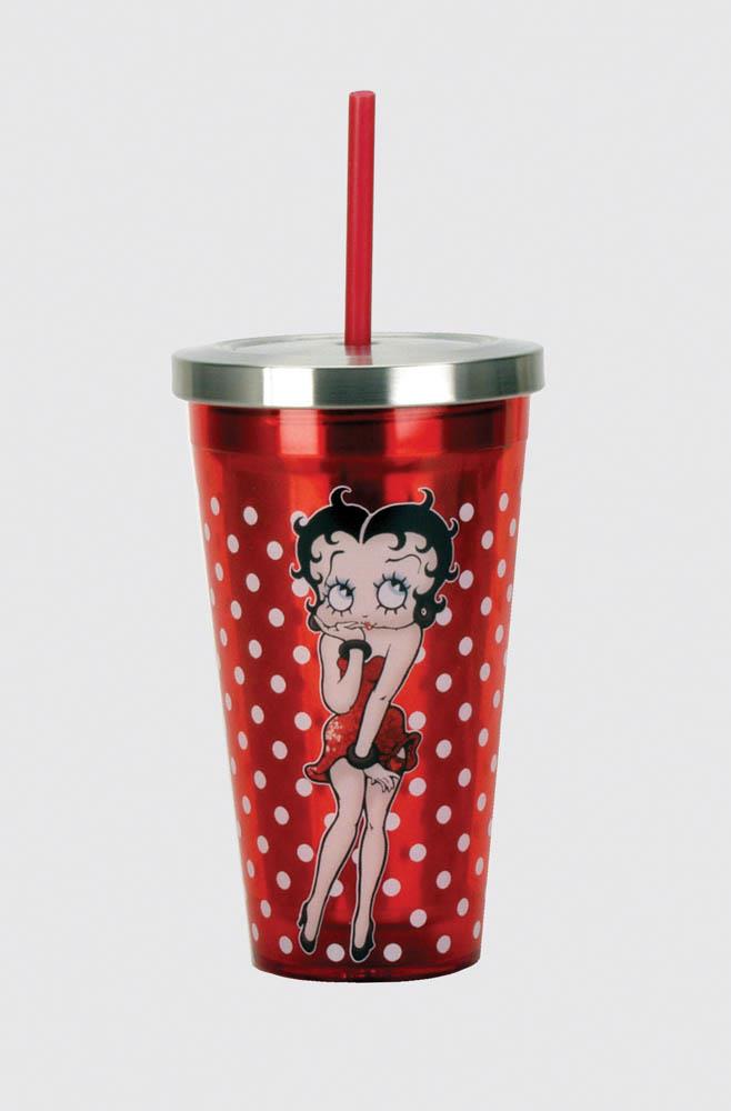 Betty Boop no spill 16 ounce cup has a stainless steel cover and lining with an acrylic outer wall. It also includes a sturdy straw and lid! California Prop 65