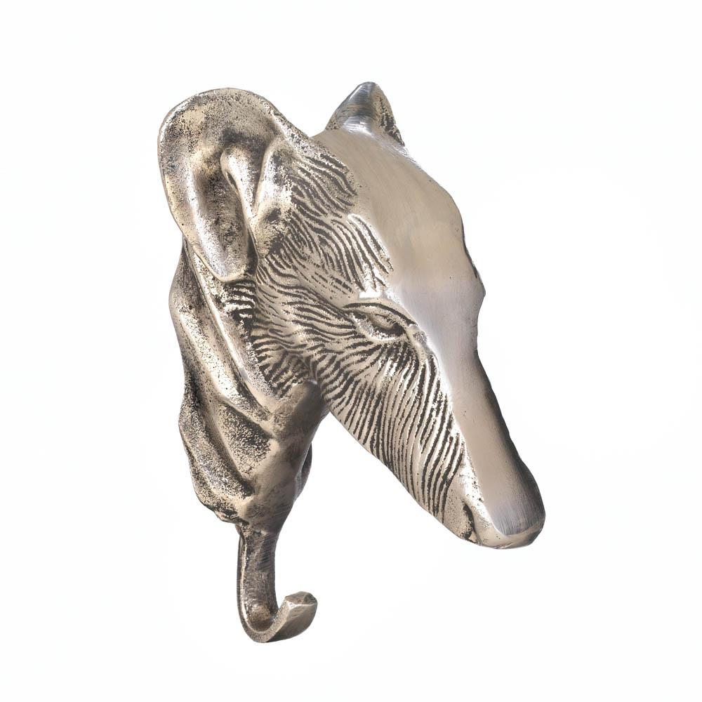 This silver dog head wall hook has fine details and features that will look great on your wall. Aluminum.