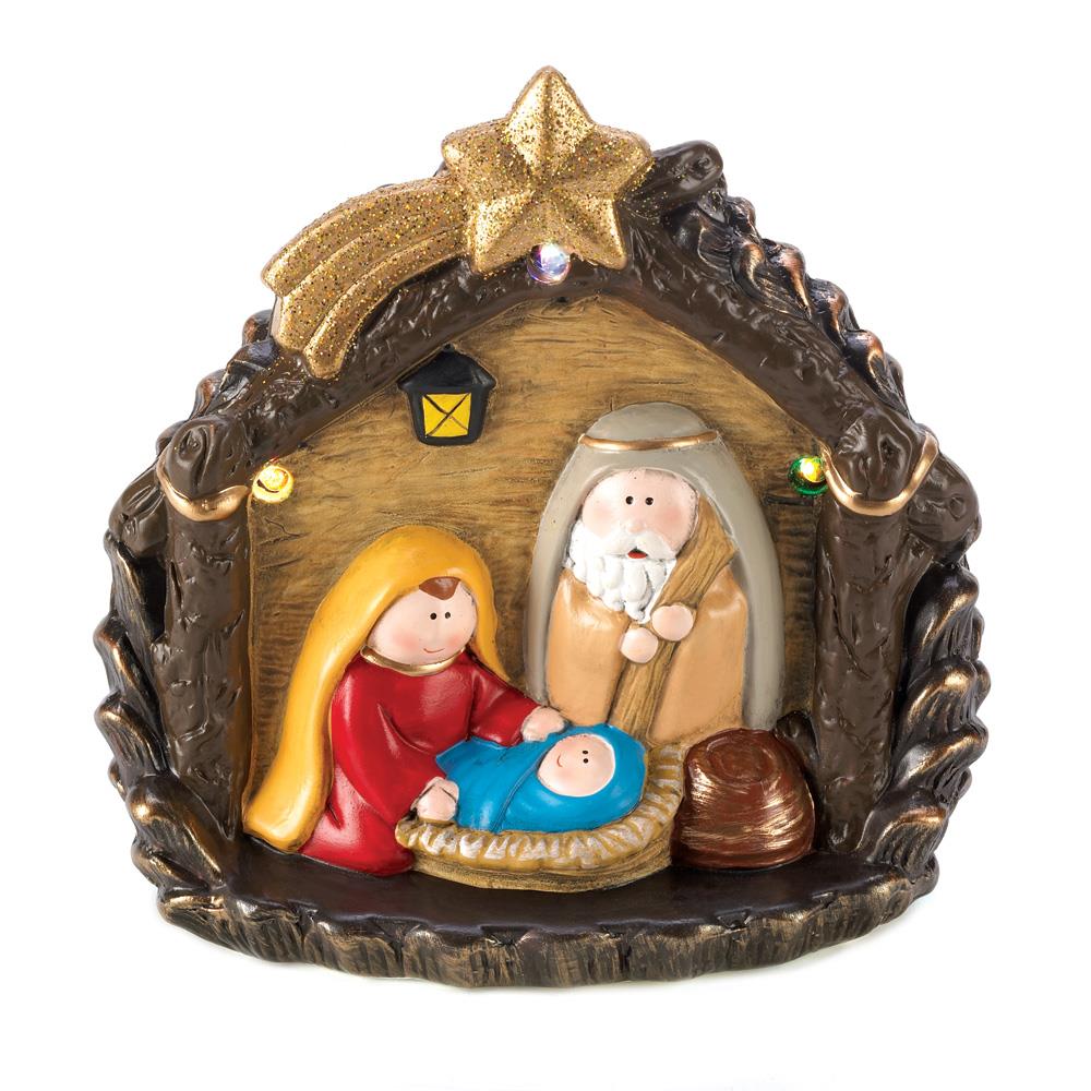 LED lights bathe the Holy Family in a glorious halo of rainbow color, setting your seasonal décor aglow. Quaint homespun craftsmanship adds casual charm to any holiday home. Ceramic. Two AG13 button cell batteries not included.