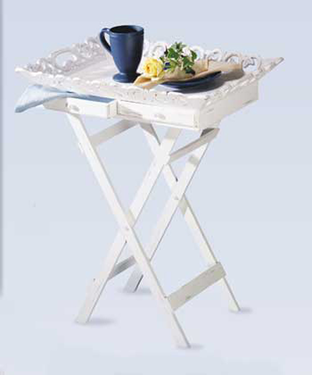 Gracious entertaining is a snap with this stylish tray table! Elegantly aged white finish with a carved rim and two handy drawers; folding legs for easy storage. Wood.