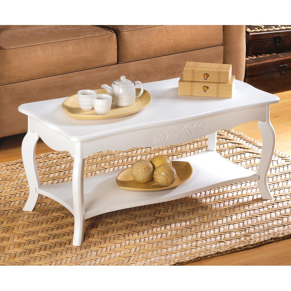 Classic coffee table with clean, graceful curves and a soft white finish. Adds cottage style appeal to any surrounding! Weight 19.6 lbs. MDF wood. Some Assembly Required.