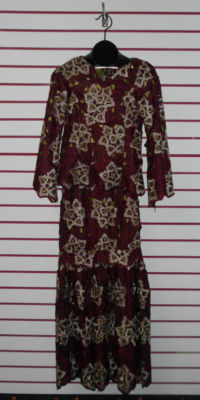 Brand New Handmade Dress Maroon Dress with Floral Pattern & Rhinestones. Bright Green Lining. Dress is around a size 5. There is a little over an inch of room that can be taken out of shirt & skirt. Shirt has a fitted bodice w/ zipper in back & 3/4 length bell sleeves. Skirt is 2-Tier top is fitted and then botton flares out. All Winning Bids & Buy it Now Purchases Can be Picked up Free of Charge at Store Location. More Items also Available at: www.jwfashionofafrica.com