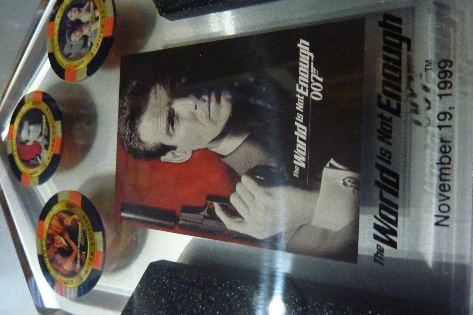 James Bond World Is Not Enough ULTRA RARE Dealer Presentation Chip Block This is a superb ultra rare James Bond Collectable. Produced by Inkworks for a small select band of dealers in conjunction with the release of their World Is Not Enough trading card set. Only 100 of these were produced. The presentation block made of acrylic houses the 3 different Casino Chips, that were released with the set, each with a matching number, plus the #1 card and features the 007 and World is not Enough Logo's and date of release. These were not on general sale and went to selected dealers mainly in the USA, so to find one in mint condition in the UK is very rare. This set is number 11 of the 100 and all the chips are numbered with the number 11. There were 3000 of each chip produced, and the majority were randomly inserted into the trading card packs, however only 100 of these presentations were produced. The item is approx 230mm high, the base is 185mm wide, the block itself is150mm wide and 25mm thick. It comes in a white outer cardboard box (which is a bit battered) and this has an official Inkworks Gold seal sticker on it.