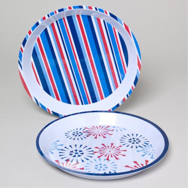 Patriotic Round Serving Tray 11.75 Inch. Stripe and Fireworks. Melamine. Case Pack 36