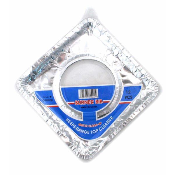12Pc Square Burner Bib made of aluminum. Keep stove cleaner with premeasured burner bibs. Fits most stove burners. Case Pack 144