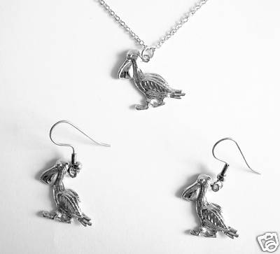 This is an earring and pendant set featuring Pelicans. The charms are produced in the USA using traditional jewelry making methods.