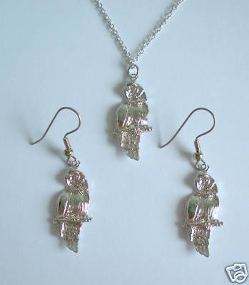 This is an earring and pendant set featuring parrots. The charms are produced in the USA using traditional jewelry making methods.
