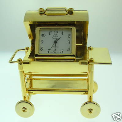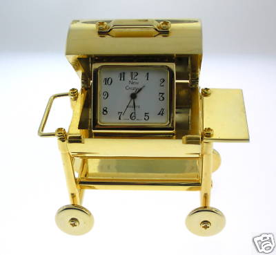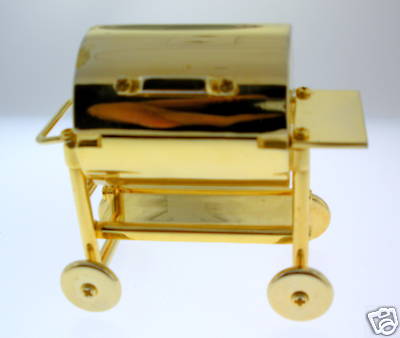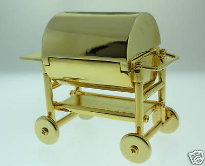 How cute is this? Great Gift idea. The brass barbeque actually holds a working clock ( battery operated). The dome lid raises up and the clock is seen. You can also place the clock in groves between the cover and base to keep it visible in the open BBQ.