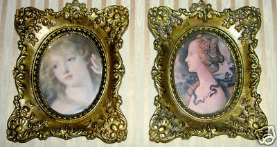 The pictures in these frames are very old prints featuring a beauty's front protrait and another's profile. These came from a family collection, so they have been taken care of and have a soft patina just right for showing off and highlighting all of the details. Coming from Europe I think they may be French in origin.