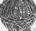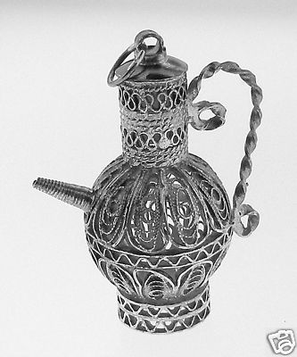 This is a pitcher created out of silver with a fineness of 950. It is made in the Syrian Style of filigree with scrolly effects and lacey designs. It measures approx. 1.5" in height. The top has a loop for hanging and it can be worn as a pendant, but it also sits flat on a shelf if so desired. I would assume it is totally handmade as no machine can do this same work.