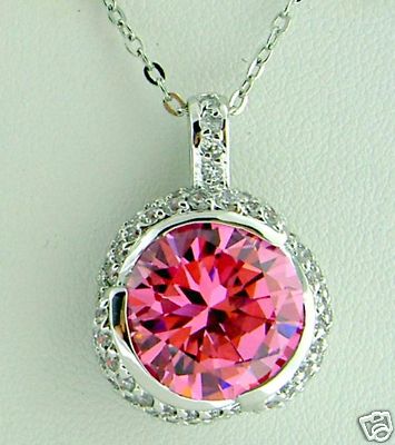 A large brilliant cut round CZ highlights this fine jewelry styled pendant. It is surrounded by all clear pave' stones handset into this beautiful mounting. Brilliant pink in color, sparkling beauty.