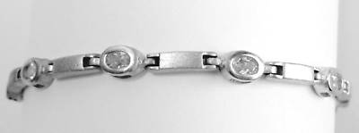 Matt finish sterling bracelet. Bezel set CZ ovals are linked by rectangle links. It is matt but has a shine to it.