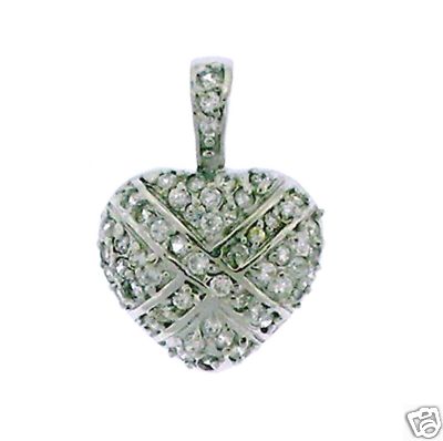 This is a puffed heart in Cubic Zirconia and 925 Sterling Silver with handset CZ's. The heart is approx. 5/8" X 5/8" and has an open back and a large bail which also has stones.