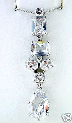 This is a beauty of a pendant. A unique style with a large pear shape, ovals, rounds and emerald cut Cubic Zirconia. Top quality stones in a platinum clad metal that is non-tarnishing.