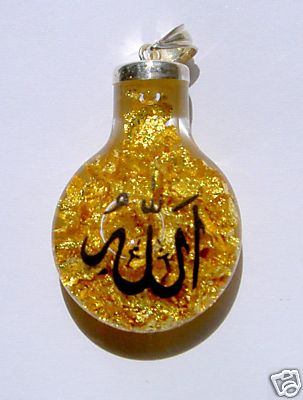 This is a very unique pendant with the name of Allah written on a hand blown glass bottle, filled with gold flakes.