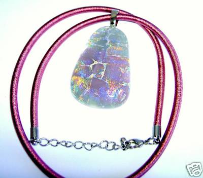 Handmade fused glass pendant in shades of Pinks and Lavender. There are so many shades and hues it looks like a large opal. A matching rose colored cord comes with this pendant.