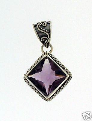 This is a pendant with a beautiful lavender amethyst centerstone. The handmade pendant is in 925 sterling silver . A large bail with scroll work design holds a large bezel set Amy ( stone approx. 12 mm X 12 mm) with a unique faceted cut. It looks almost like a star in the center. A rope design surrounds the bottom half of the bezel for extra feature.