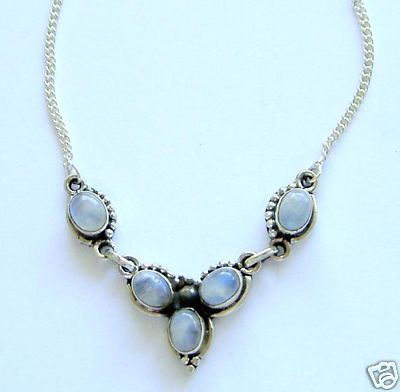 Artisan style sterling necklace with five bezel set oval moonstones. The center motif is held by a sterling chain. The total measurement is a little over 16". Easy to wear, ethnic looking with accented details.