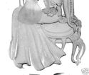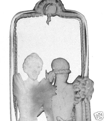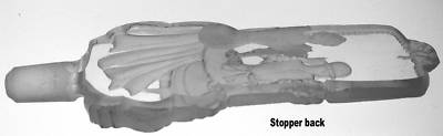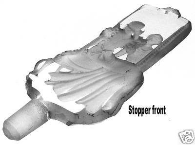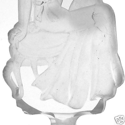 This is a beautiful glass stopper for a perfume bottle. It is frosted and polished crystal that measures 5" in length and is 2" wide. The art deco design is that of a lady sitting in front of a vanity mirror fixing her hair. Her elegant gown, hairdo and features are carved out in design and highlighted by glass frosting. You can see her face in the mirrors reflection. The dress is flowing and has puffy sleeves and a bow in the back.